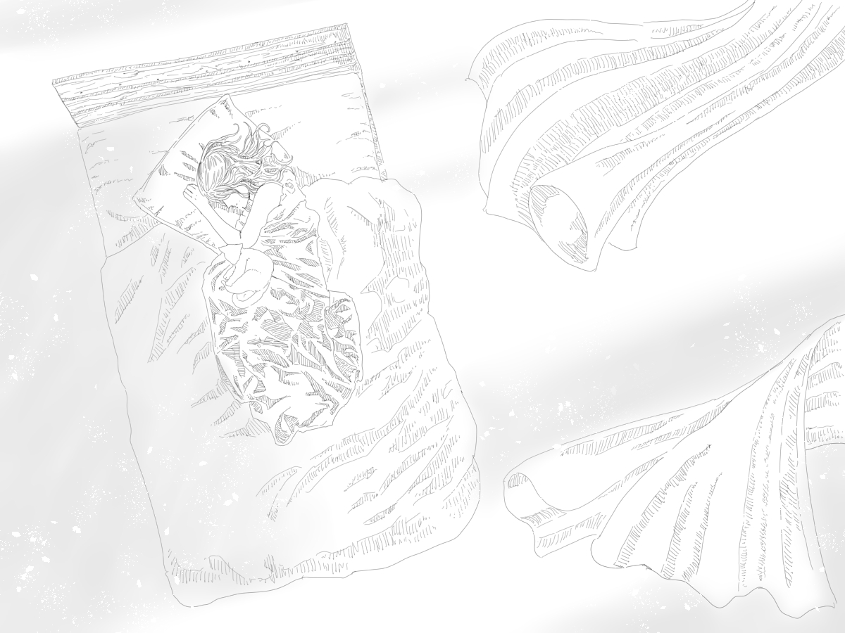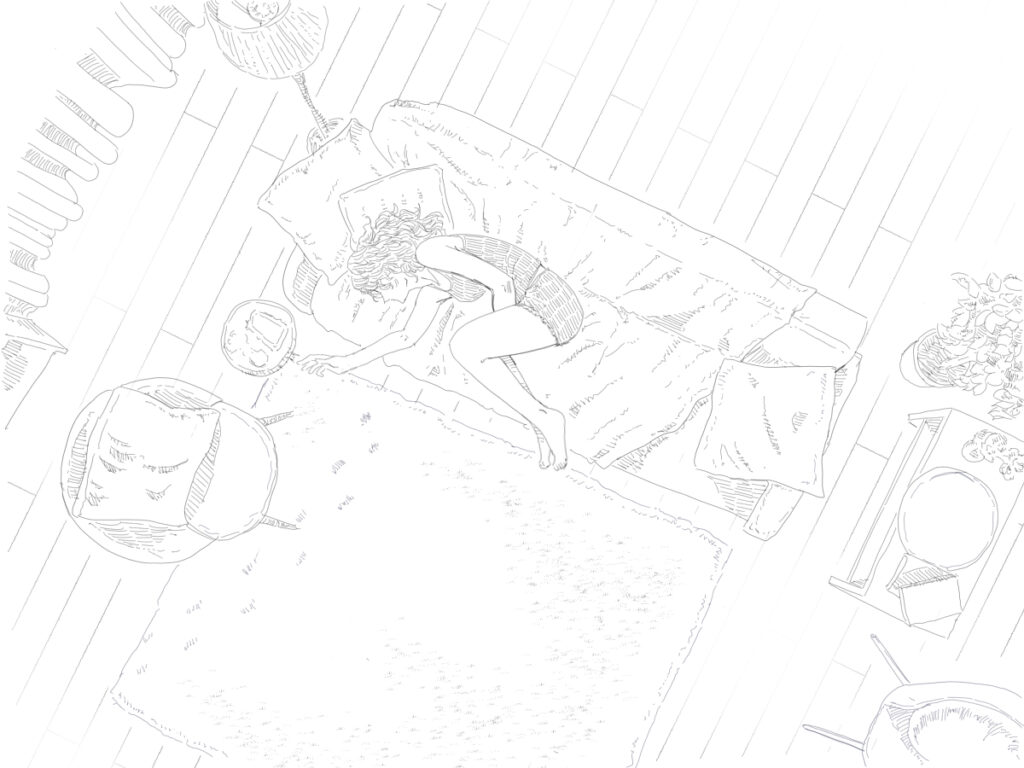 イラスト一枚目の女性は、自室ではないどこか「遠い部屋」で微睡んでいます。とても現実味のない場所で、側にはいるはずのない「君に会った」。すぐにでも飛び起きて抱きしめたいのに、身体が重く、とてつもない眠気にどうしても勝てません。何か君に話しかけた気がしますが、「会話のひとつも思い出せない」ほど曖昧で泡沫の様な空間でした。