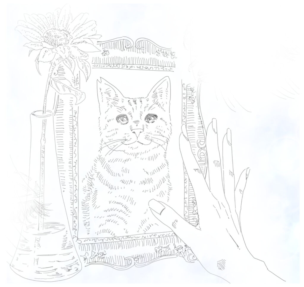悲しみがピークの時は、夢か現実かわからない状態でよく猫の夢をみていたものです。始めは夢の中で夢と分かっているのに、気づいたらそれが現実かのようにのめり込んでて、目が覚めた瞬間に絶望するあの感じ。だけどもそんな感情を優しい調べで包んでくれる曲。そんな景色をイラストにしてみました。